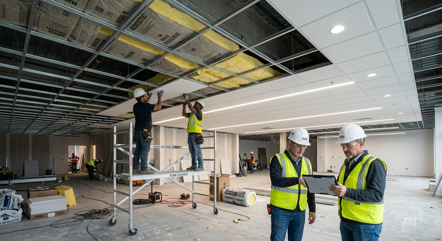 Installation of suspended ceilings and high-performance insulation materials for enhanced acoustic and thermal efficiency.